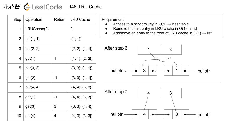 cache.put(1, 1); cache.put(2, 2); cache.get(1); // returns 1 cache.put(3, 3); // evicts key 2 cache.get(2); // returns -1 (not found) cache.put(4, 4); // evicts key 1 cache.get(1); // returns -1 (not found) cache.get(3); // returns 3 cache.get(4); // returns 4