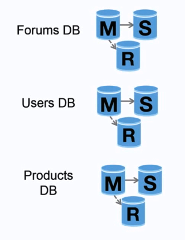 Federation (or functional partitioning) splits up databases by function. For example, instead of a single, monolithic database, you could have three databases: forums, users, and products, resulting in less read and write traffic to each database and therefore less replication lag. Smaller databases result in more data that can fit in memory, which in turn results in more cache hits due to improved cache locality. With no single central master serializing writes you can write in parallel, increasing throughput.