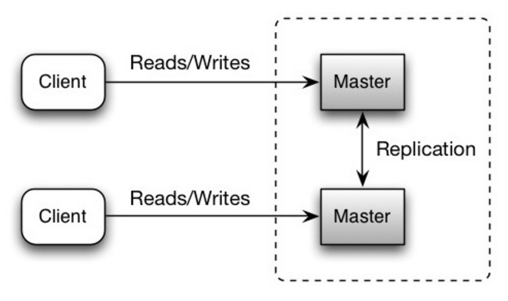 Both masters serve reads and writes and coordinate with each other on writes. If either master goes down, the system can continue to operate with both reads and writes.